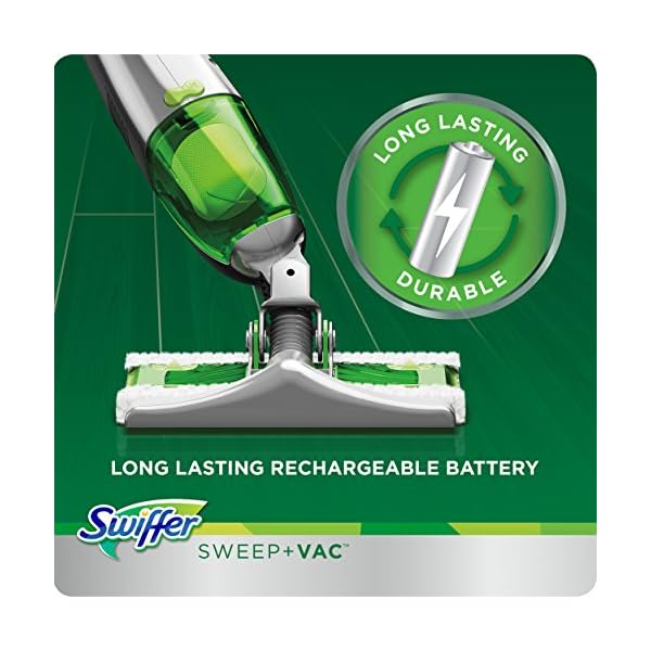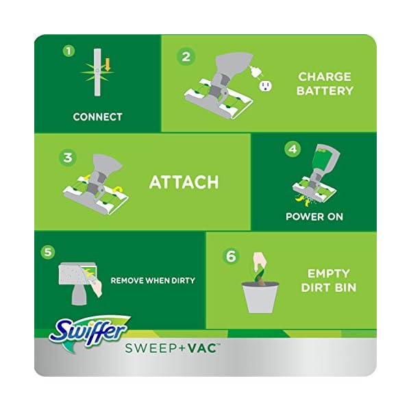 Swiffer Sweep + Vac is a chargeable, cordless sweeping system designed to scrub dirt, dust and hair. The Sweep + Vac uses a thick Swiffer Sweeper dry sweeping cloth to dig deep and pick out up dirt from textured grout lines and crevices. Then its powerful vacuum grabs larger particles like crumbs. Assembly required.usage instructions 1. connect deal with to body until click is heard 2. charge battery 3. atttach dry sweeping cloths 4. press power button for suction 5. put off cloth when dirty 6. empty bin and replace filter out securely storage instructions battery should be recycled or disposed of properly.